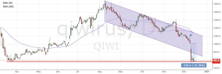 В последствии они выросли до 1500 руб., откуда планомерно, начиная с осени, начали снижаться. Именно тогда начались проверки Банка России в отношении Qiwi. Те, кто знал о возможных проблемах, начал скидывать акции ещё тогда. Обычные инвесторы узнали о проблемах в отчетности Qiwi банка и штрафных санкциях только в декабре.