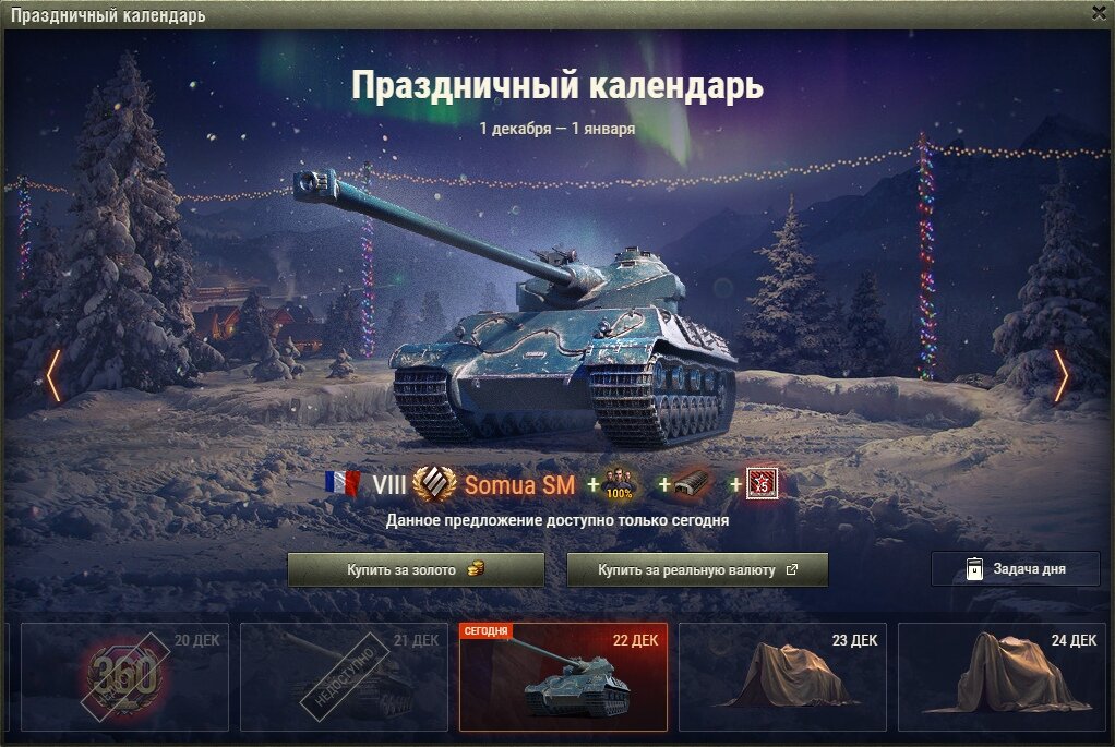 Предложение дня: С 22 декабря 09:00 (МСК) до 23 декабря 09:00 (МСК) премиум танк дня — Somua SM. Можно купить в клиенте за голду:10 200