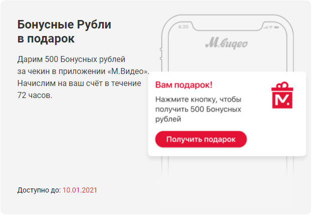 Всего лишь надо установить приложение Мвидео на телефон, потом зарегистрироваться или авторизоваться в нем. Зарегистрироваться в бонусной программе. Далее на главной страничке нажать кнопку "Получить подарок". В течение 72 часов бонусы будут начислены на ваш