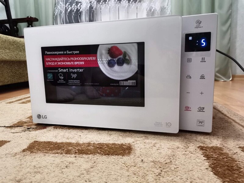 Микроволновую печь наша семья выбирала долго. До этого пользовались абсолютно простой механической микроволновкой белорусского производства бренда Midea. Сделали выводы и для нас принципиально важным моментами при выборе стали: белый цвет (как оказалось для кухни он более практичен по сравнению с серебристым металликом и чёрным цветами), высокая мощность (прошлая была на 700вт, неплохо, но хочется более быстрого разогрева), ну и третий момент это электронное управление (на прежней микроволновке столкнулись с проблемой невозможности установить разогрев на малый промежуток времени, получалось неточно и в целом всегда раздражало). Однажды мы положили глаз на почти такую же модель, только с грилем (в этой модификации гриля нет, но нам он и не нужен, поскольку есть весьма многофункциональный электрический духовой шкаф). Цена конечно кусалась, она стоит порядка 10000 рублей! Долго она лежала в закладках личного кабинета. Время близилось к началу ремонта на квартире и мы все-таки решили приобрести данный кухонный прибор. Но вдруг мы обнаружили модель СОЛО LG MW23R35GIH без гриля по доступной цене 7500 рублей, плюс бонусы, получается достаточно выгодно за инверторную микроволновую печь мощностью в 1000 Вт.