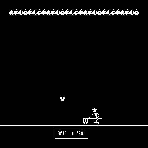 Внизу счётчик пропущенных и пойманных яблок. Человечек бегает довольно резво и поймать яблоко нелегко. Игра заканчивается, когда человечек получает яблоком по голове.
