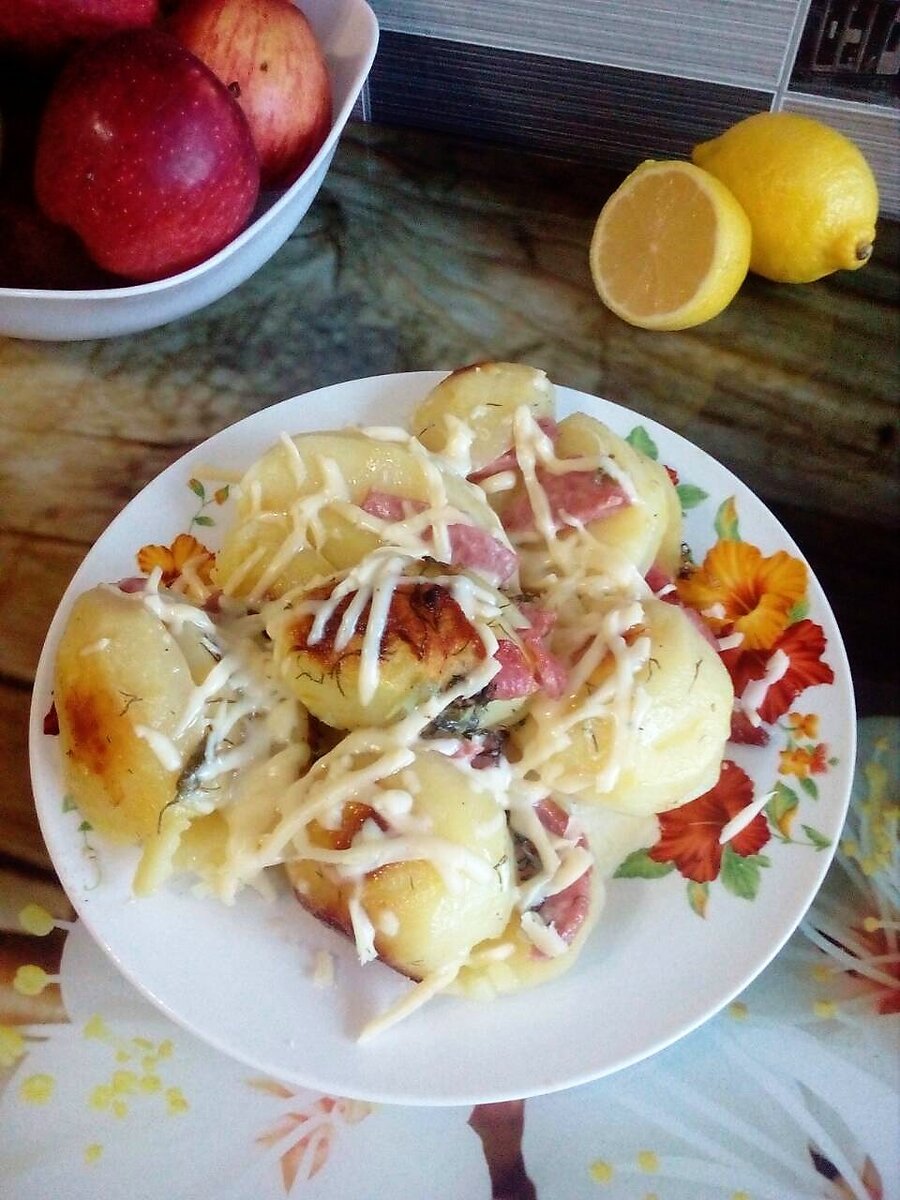 Затем нарезаем ветчину или колбасу ( я использовала колбасу) пластинками, так чтобы они поместились в надрезах и начиним картошку.