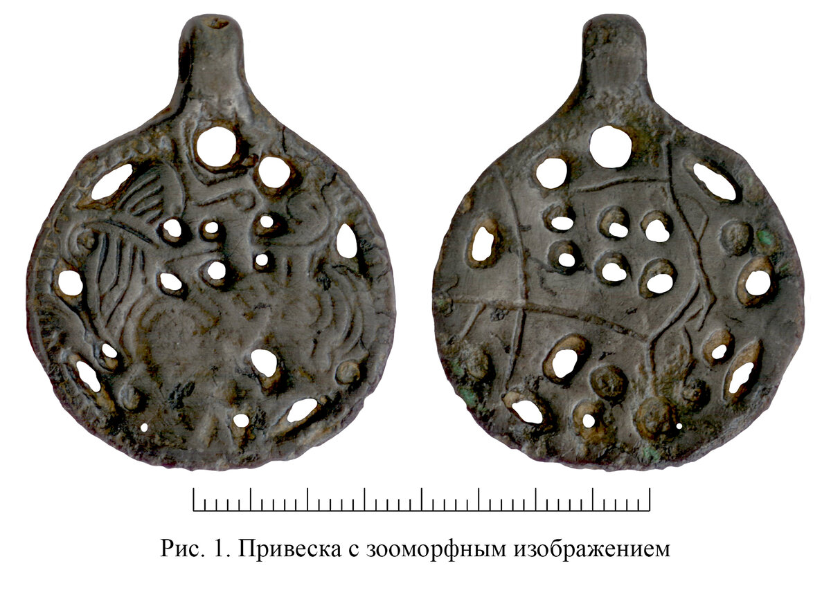 По полученным в интернете сведениям, весной 2019 г. в окрестностях д. Малые Дубравы Сергиево-Посадского района Московской области была найдена круглая прорезная привеска размерами 40X33 мм, отлитая из высокооловянистой бронзы (рис. 1). К сожалению, нюансы изображения на ней нельзя идентифицировать из-за брака литья, но ясно, что изделие отлито по оттиску прототипа, основное поле лицевой стороны которого занимало рельефное изображение существа с извивающимся лентообразным телом. Тело заканчивалось хвостом, идущим из-под тела вверх, обвивающим шею и возвращающимся к крупу. Гладкая голова существа повернута вправо, к хвосту, пасть открыта. Одна лапа направлена вперед и вверх. Вторая лапа выполнена в виде раздвоенного завитка и направлена назад. Изображение заключено в рамку, состоящую из двух валиков: рубчатого внутреннего и гладкого наружного. В верхней части привески находится широкое ушко, на котором просматриваются следы вертикальных валиков. При производстве привески полученная по оттиску прототипа форма была заполнена воском, после чего полученная модель с присоединенными литником и выпаром были обжаты глиняными кругляшами [1]. В ходе последней операции в глину попали травинки, отпечатавшиеся на оборотной стороне, создавая иллюзию растительного орнамента.