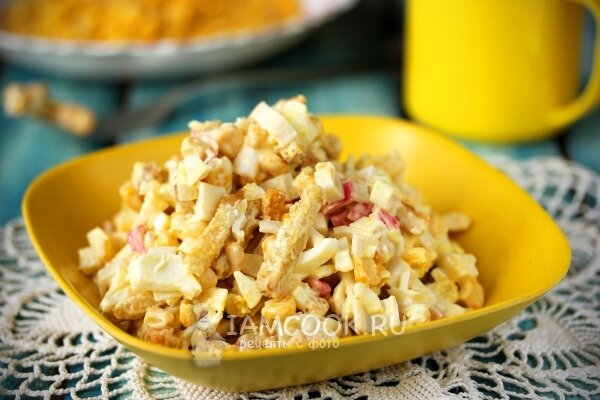 Для салата нам понадобится: Крабовые палочки – 250 гСыр плавленый – 200 гЧеснок – 2 зубчикаЯйца вареные – 3 шт.Сухарики пшеничные – 70 гКукуруза – 100 гМайонез – 150 г. Рецепт можно найти в интернете.