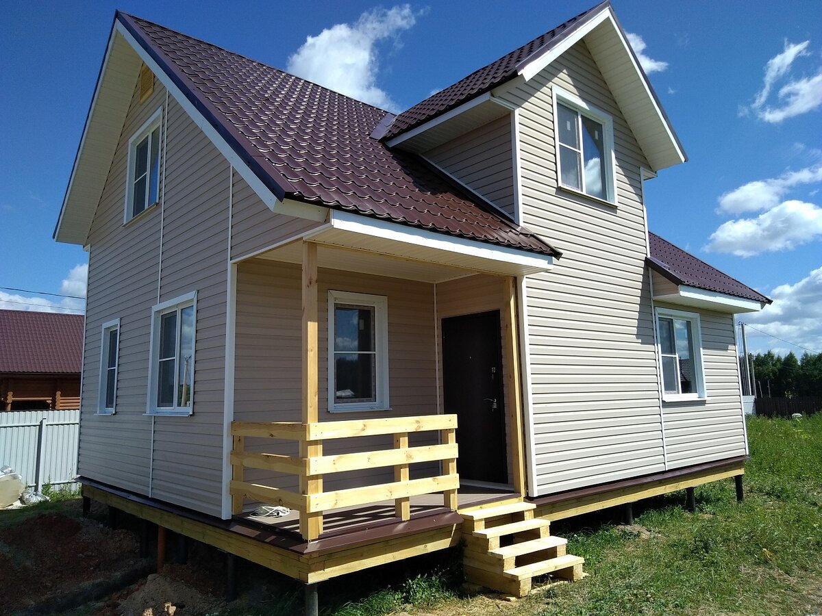 "Не до изысков" - говорят наши заказчики и просят построить быстро и качественно самый обычный дом, чтобы в случае чего просто телепортироваться из квартиры в городе в самую душу природы - свой дом. Просто-то мы умеем, но проекты выбираем не самые простые, как пример ТОРОНТО в Можайском районе, КП Захарьино-3. Дом на основе проекта ТОРОНТО, размером 7,2х9м, по каркасной технологии со стойками 40х150 мм и утеплителем Paroc Extra Light 150мм. На свайно-винтовом фундаменте, с закладными для канализации и воды. Кровля - металлочерепица 0,45 мм, цвета шоколад. Отливы - в цвет кровли, кровля подшиты софитами белого цвета. Отделка внешняя - виниловый сайдинг DOCKE (цвет Крем-брюле), внутри - сдавали в пароизоляции - внутренние работы не производились. Проект Торонто немного видоизменили, в целом же планировки остались прежними: Размер 9,9*7,2м, 123 кв.м площади , уютная кухня - гостиная, ванна и при желании можно сауну встроить, тех помещение с крыльцом, спальня. На втором этаже - 3 к