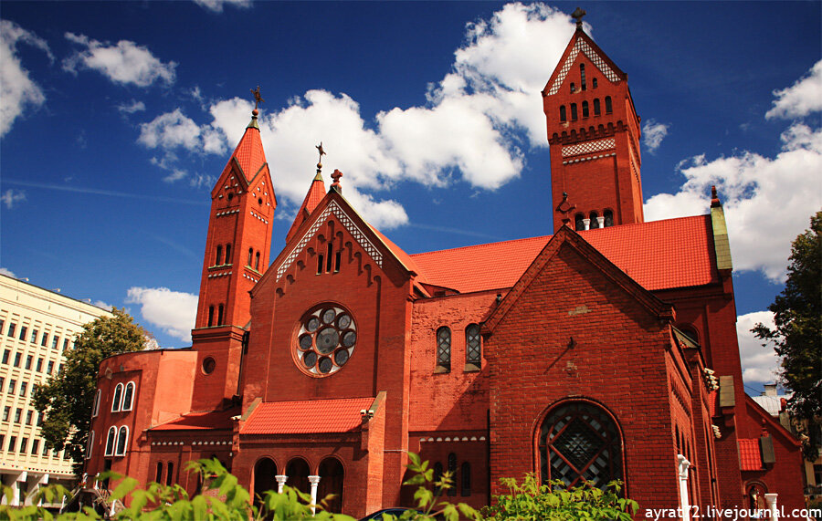 Дворянин Эдвард Войнилович построил костел в память о своих детях, умерших в раннем детстве. Собственно, официально храм так и называется - Костел Святого Симеона и Святой Елены, но в народе больше в ходу название Красный костел. Год постройки 1905-й. Расположен костел на Площади Независимости.