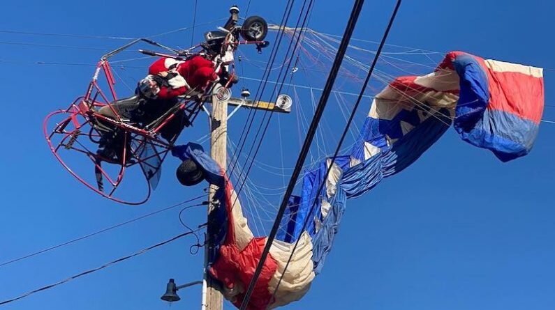 Мужчину с парашютом, одетого Санта-Клаусом, пришлось спасать пожарным округа Сакраменто (Калифорния) после того, как он застрял на линии электропередач в воскресенье утром « Как сообщает www.usa.one.