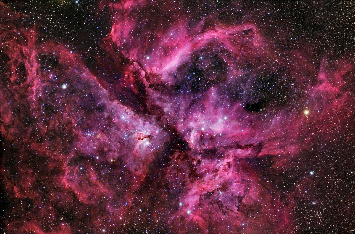 Да, можно сделать атом макроскопическим, и это называется «атомом Ридберга». В таком атоме возбуждённые электроны, окружающие атомное ядро, находятся почти на пороге полного отрыва от ядра. Чтобы увидеть атом Ридберга, можно взглянуть на небо, на туманность, подобную изображённой на рисунке ниже. Туманности полны атомов водорода, а красное свечение возникает в результате возбуждённых состояний этих атомов. Некоторые из них, вероятно, являются ридберговскими атомами.