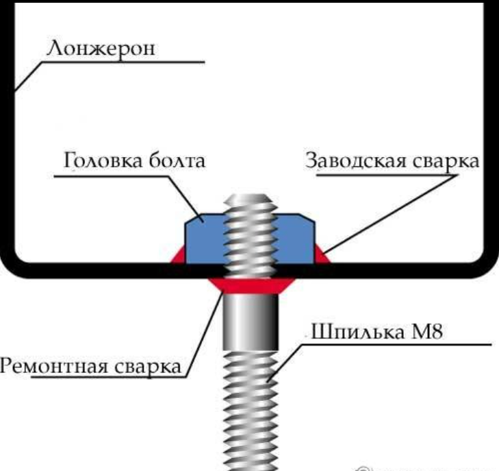 Кстати, знакомство с машиной началось с ремонта шпильки крепления стабилизатора. Точнее, не шпильки, а болта, вваренного изнутри левого лонжерона: еще на первой тысяче пробега болт лопнул. Но заметили мы это не сразу, а лишь когда при нанесении антикора осмотрели машину на подъемнике. Способов ремонта было предложено немало: разрезать лонжерон и приварить новый болт, просверлить сбоку отверстие диаметром 20 мм... Мы выбрали путь, который вполне себя оправдал, — просверлили в оставшейся головке болта отверстие и нарезали в нем резьбу М8. Затем ввернули туда подходящей длины шпильку, и сваркой «Кемпи» обварили ее по диаметру, чтобы не проворачивалась и держалась прочнее. Кстати, в головке болта удалось нарезать полноценных четыре нитки резьбы — так что в целом прочность узла оказалась достаточно высокой. Более 30 тыс. км пробега, в числе которых, не забывайте, две с половиной тысячи жесточайшего зимнего теста, показали, что ремонтную технологию мы выбрали правильно.