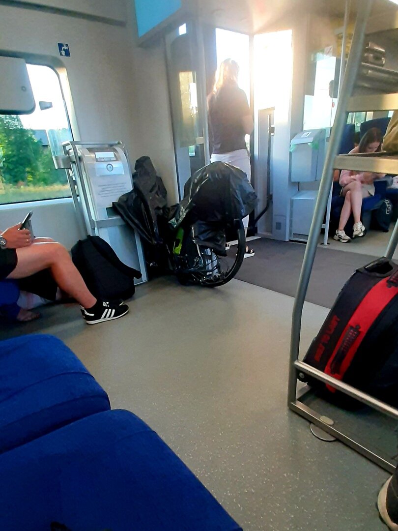 Съел окрошку, снова надел форму. Взял велосипед, поехал на вокзал.