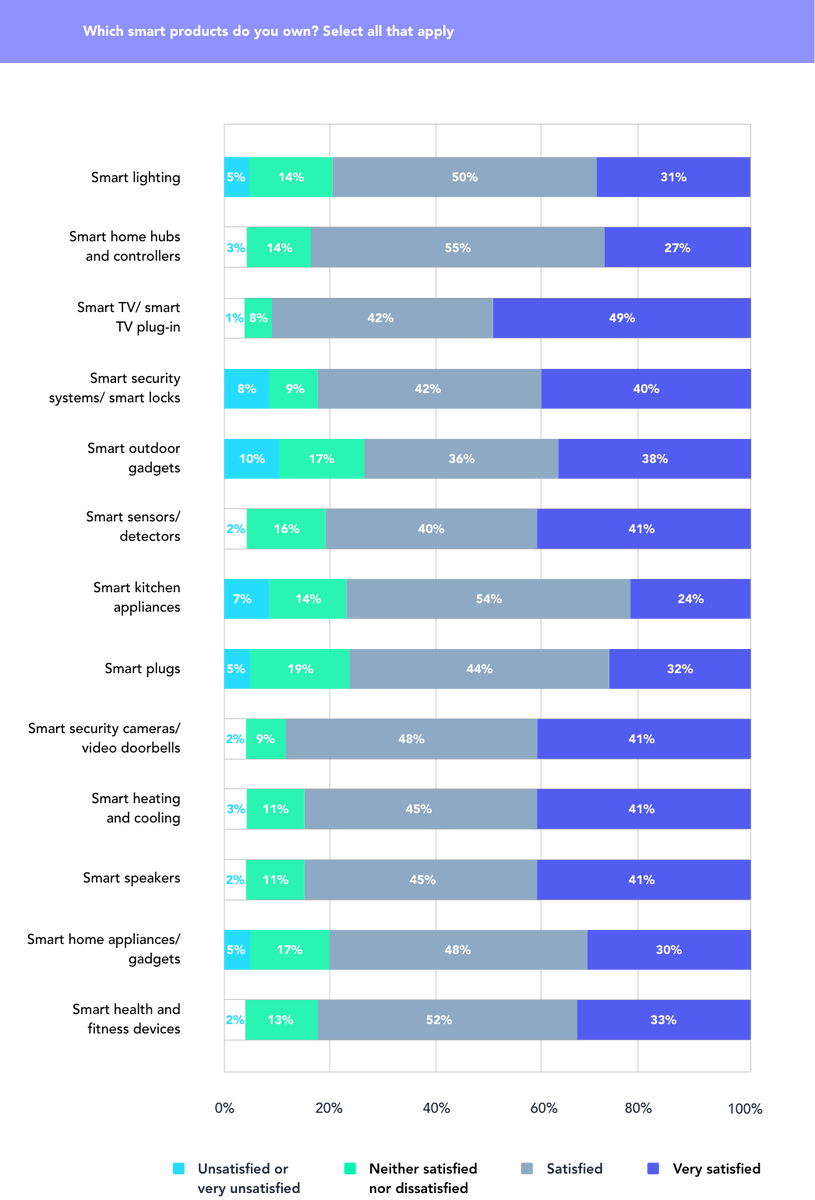 Учитывая их популярность, неудивительно также, что большинство людей были довольны своими умными телевизорами, телевизионными плагинами и умными динамиками. В целом потребители довольны своими интеллектуальными технологическими покупками.