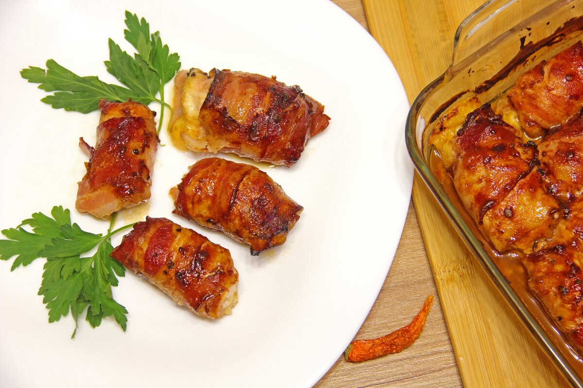 На разделочную доску кладу 2 (иногда 1) полоски бекона впритык друг к другу. Заворачиваю рулетик в бекон. Советую покупать уже нарезанный на тонкие пластины бекон. Так ваши рулетики будут выглядеть аккуратнее.