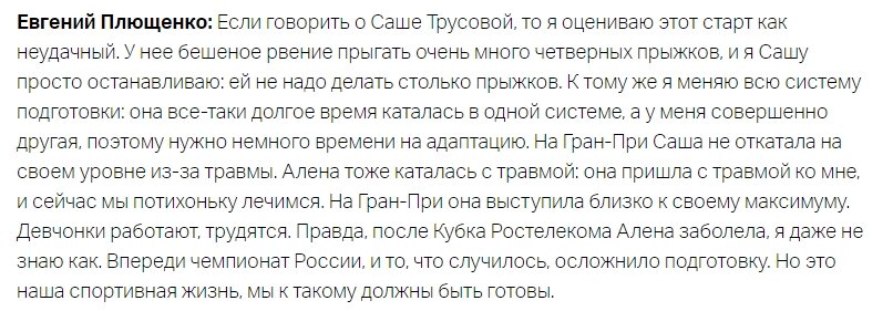 После провального для Плющенко, как тренера, этапа Гран-при в Москве многие ждали его комментариев. Но, Плющенко хранил молчание. Теперь наконец-то вышло интервью, где он рассказывает и о результатах его учениц, и о своей тренерской деятельности в целом. Но если честно, интервью вызывает очень много вопросов. Давайте вместе почитаем?