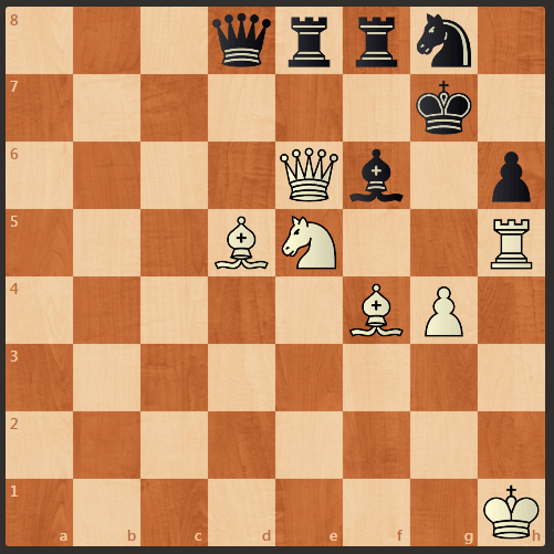 Очередная шахматная задача. У черных лишнее "качество". Черного короля защищают практически все черные фигуры. У белых под боем ферзь. Если белый ферзь отойдет на f5, то черные могут забрать коня на е5. Однако ход белых, и они выигрывают.