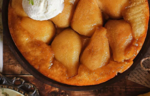 Готовый десерт переворачиваем тестом вниз на тарелку. Режем и подаем, отлично сочетается с мороженным.