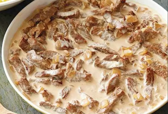 Говядину режем тонкими полосками. Хорошо разогреваем сковородку, добавляем на нее масло, обжариваем чеснок с луком примерно 5 минут. Сюда же добавляем наше мясо и жарим на среднем огне, постоянно мешая около 7 минут. Добавляем муку и жарим еще несколько минут, постоянно мешая. После этого добавляем сметану, хорошо все перемешиваем и готовим еще 3 минуты. Далее добавляем специи по вкусу, тушим еще 15 минут под крышкой.