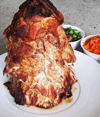 Берем толстую шпажку, закрепляем ее в картофеле и нанизываем на нее наше мясо, сверху закрепляем помидором. Отправляем в духовку на 40 минут при 200 градусах. После чего готовую часть курицы отрезаем и оставшуюся часть снова отправляем в духовку на 15 минут. После этого обрезаем этапами готовое мясо.