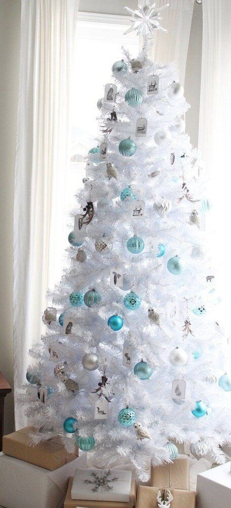 Не знаете, как украсить белую ёлку? А как вам такой вариант? Идеальное сочетание серебряных и голубых (синих или цвета морской волны) шаров на белой ёлке. Стильный новогодний символ в духе бодрого зимнего утра.