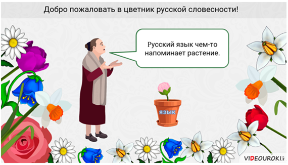 На уроке мы будем рассуждать о русском языке при помощи метафор. Ведь русский язык, в сущности, чем-то напоминает растение. Например, в разных условиях он ведет себя по-разному. Идеальной для русского языка является литературная среда: в ней он расцветает и проявляет все свои качества.