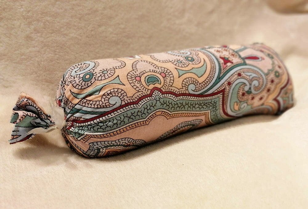 Валик – это цилиндрический мешочек из плотной бязи, длиной 35 см и диаметром 9 см. Он плотно набит сушеной измельченной травой лаванды, пустырника, ромашки, шалфея и стружки можжевельника. Валик распространяется не сильный, но приятный аромат трав, поэтому дополнительно успокаивает и после вечерней зарядки помогает уснуть крепко.