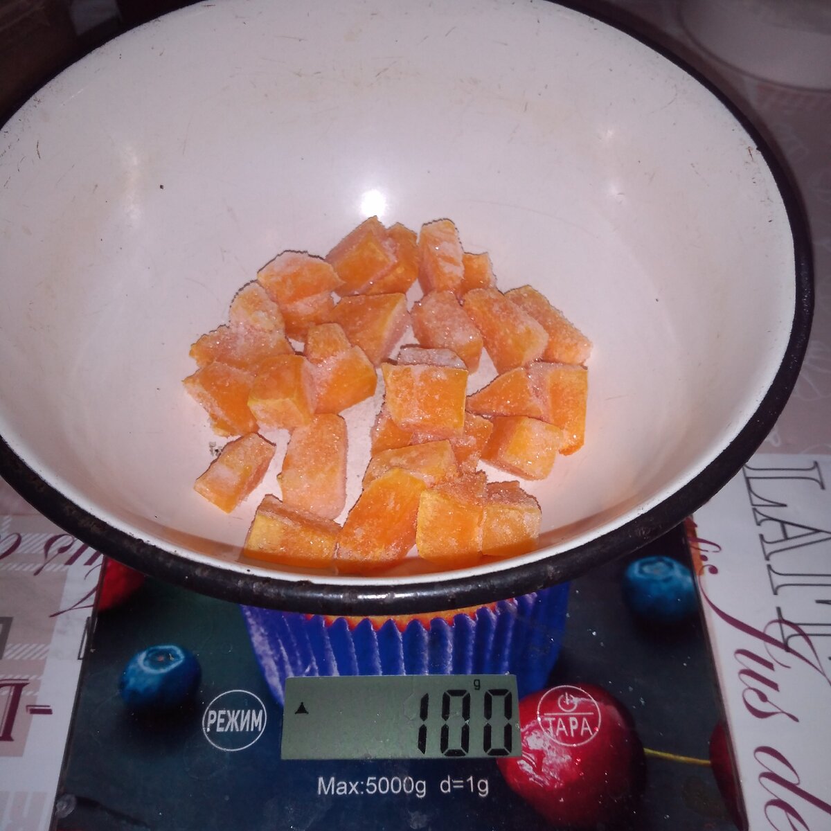 Для пирожного я использовала 100 г замороженной тыквы. Заранее ее достала и дала оттаять.