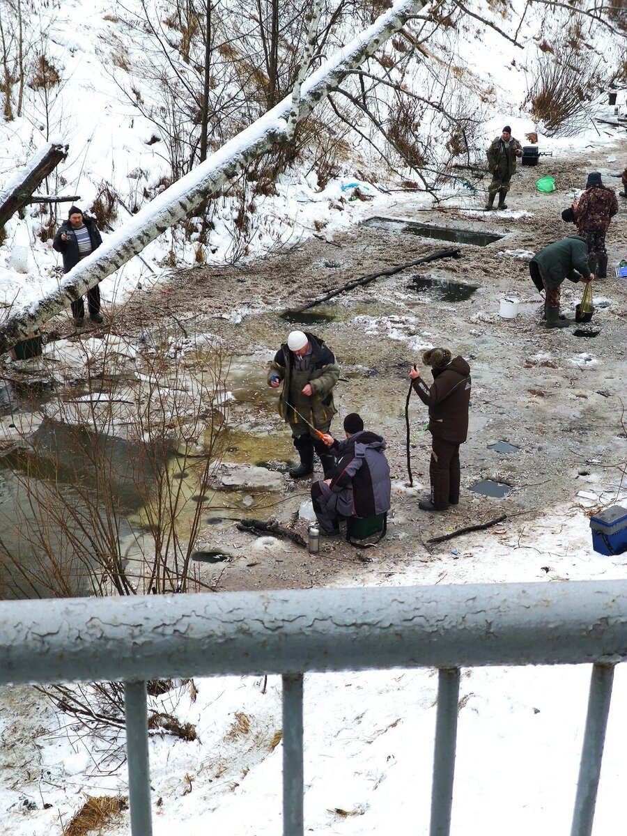 Любители зимней рыбалки вырубили майны и багрят рыбу, упаковывая крупную в ящики, а прочую мелочь, вместо того, чтобы выпустить обратно в речку, выбрасывают на лёд.