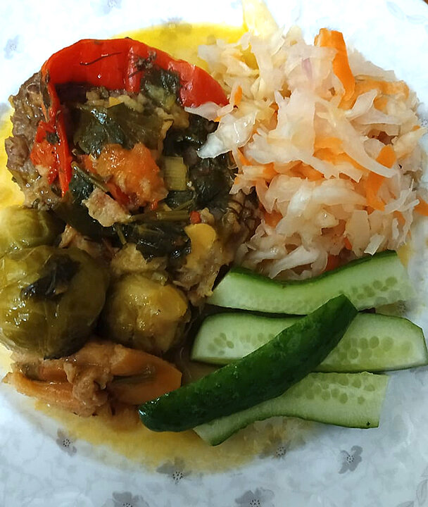 Из приправ. Мясо посыпал перцем черным, красным, куркумой, солью, зиры добавил. Мясо в таджин сложил горкой, с зеленью и овощами вперемешку. И пусть томится. Доходить будет, чесноку добавлю. Морковку потом можно выкинуть.