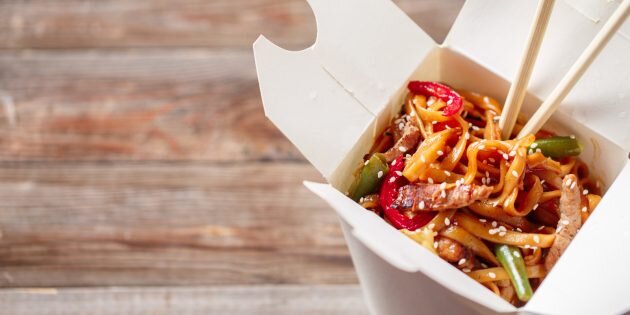 Можно, конечно, тренировать ловкость пальцев, вылавливая палочками лапшу и рис из уголков коробки. А можно развернуть коробку, тогда она станет тарелкой, есть из которой намного удобнее.