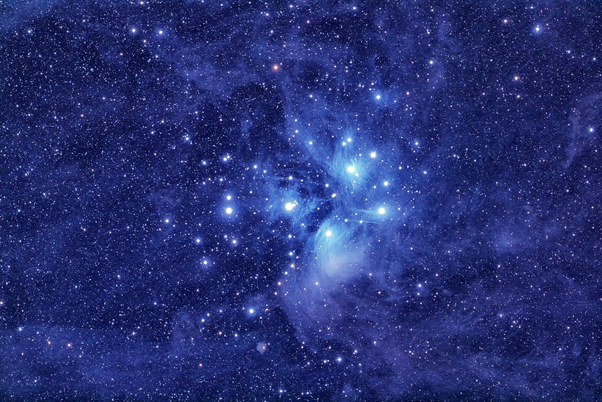 Плеяды — небольшое звездное скопление в созвездии Тельца, примерно в 400-450 световых годах от нас. Астрономы предполагают, что в нем может быть 2-3 тысячи звезд, однако на сегодняшний день открыты только 1200. Остальные, вероятно, слишком тусклы, чтобы их можно было разглядеть даже в неплохой телескоп.