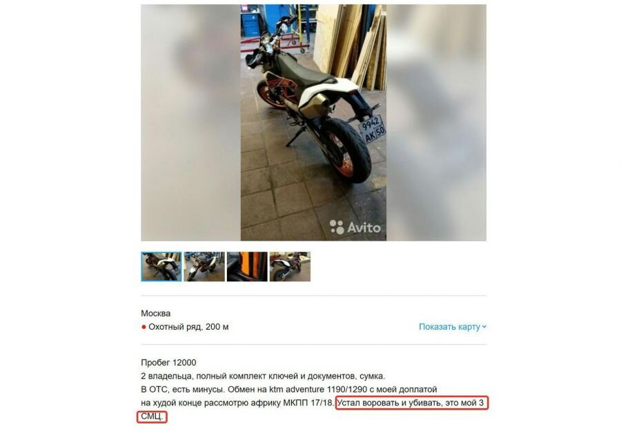 Необычный мотоцикл. На одном из сайтов владелец разместил объявление о продаже мотоцикла модели KTM. Как сообщается, у транспортного средства было два владельца, а теперешний согласен на обмен на более дорогую комплектацию с его доплатой. В конце объявления водитель добавил, что устал "воровать и убивать", а это его третья модель КТМ.