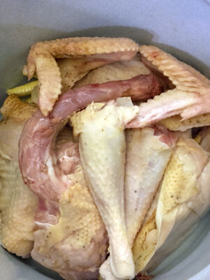 Вынимаем из бульона мясо и процеживаем бульон (при необходимости бульон досаливаем). Я не перегружаю бульон специями - он вкусен сам по себе. Холодное мясо петуха отделяем от костей и разбираем на волокна.