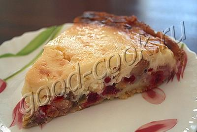 - Пришло мне вот такое письмо: "Здравствуйте! Вопрос по сливовому и вишневому пирогу: чем можно заменить в помадке яйца - моей дочке нельзя?" В качестве ответа я сделала вот этот пирог - тоже с ягодами и помадкой-заливкой, но без единого яйца. Ягоды-фрукты в него можно класть любые, какие нравятся. Я положила клюкву, яблоки, изюм и фейхоа - всего понемножку. Пирог вполне приятный - нижний слой пропёкся и стал нормальным цельным коржом. Верхняя заливка схватилась, но не сильно - осталась мажущей консистенции. Если нужно, чтобы она стала монолитной, крахмала следует положить не 3, а 5 ложек. В заливке очень приятно чувствуется шоколад, который хорошо сочетается с кислыми ягодами.
