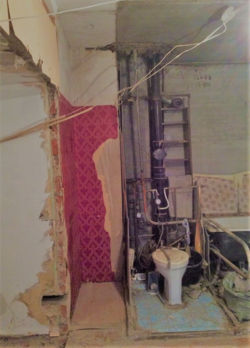 Честно сказать из такого борделя было сложно понять за что браться. Как видим стены все обшарпаны, побитые до ужаса, рваные обои. Тем более сразу бросается вся эта конструкция из ржавых потекших труб.