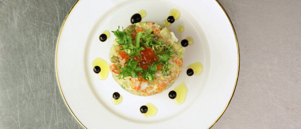 Оливье с копченой рыбой и камчатским крабом