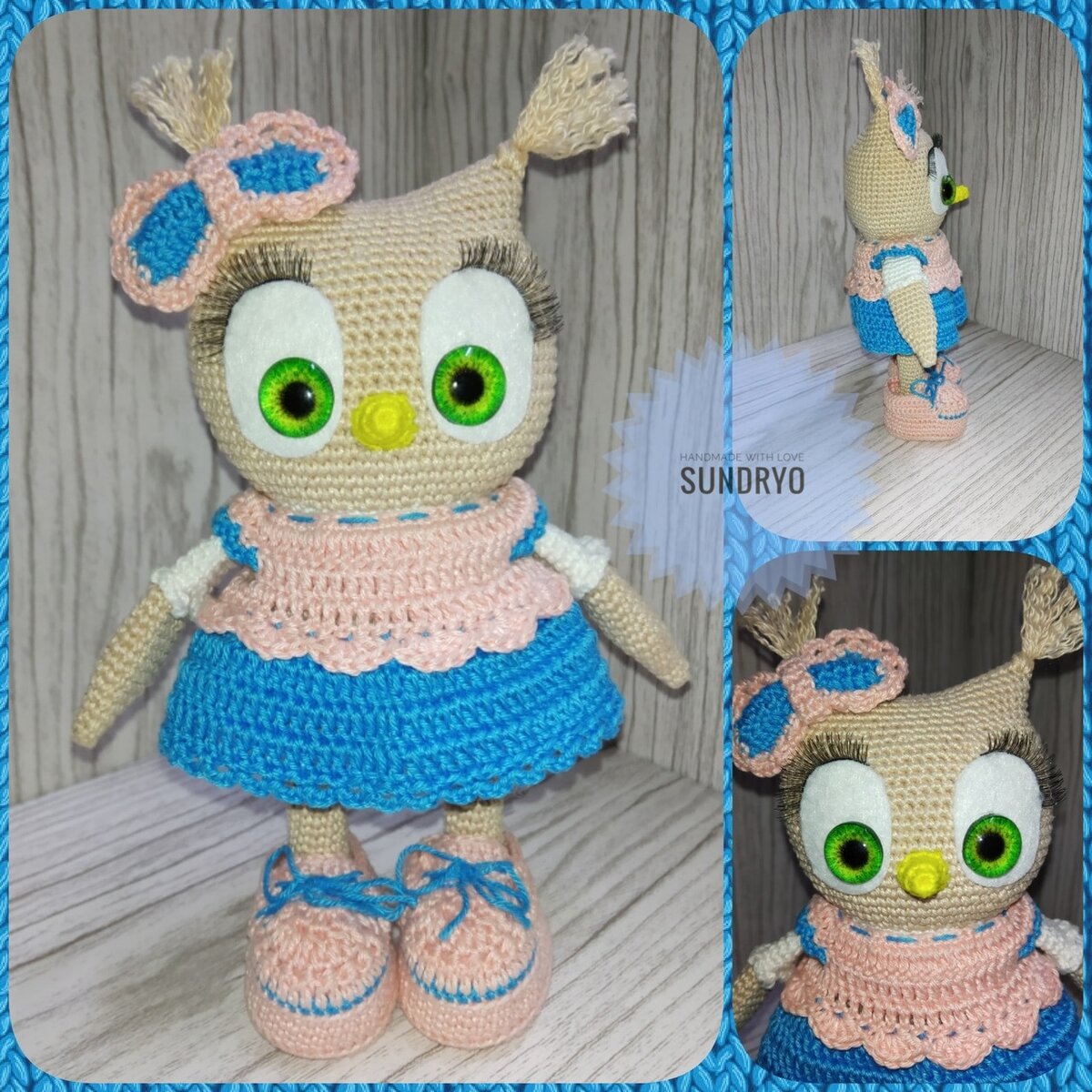 И давно нашла прикольную Сову в кедах. И наконец-то решила связать. И так она мне понравилась, что связала их 2 в разных цветах и платьях разного цвета.