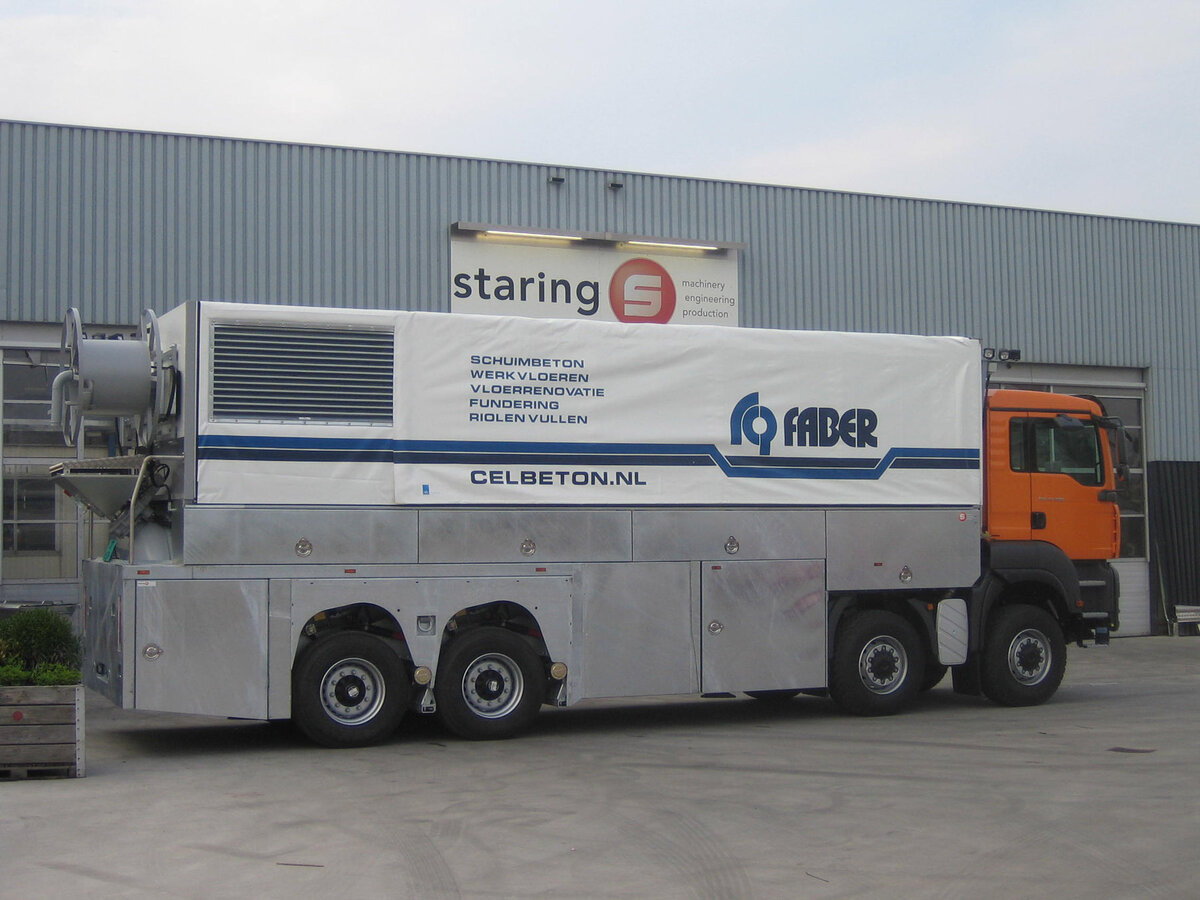 Маленькое предприятие из Нидерландов Staring BV несколько лет назад на шасси MAN (8x4) сделало специальный строительный грузовик со встроенной бетоносмесительной установкой. У заказчика – строительной фирмы Faber CellConcreteбыли были особенные требования к оборудованию, и чтобы решить их потребовались совершенно неординарные подходы. Именно они привели к кардинальной переделке стандартного четырехосного шасси.