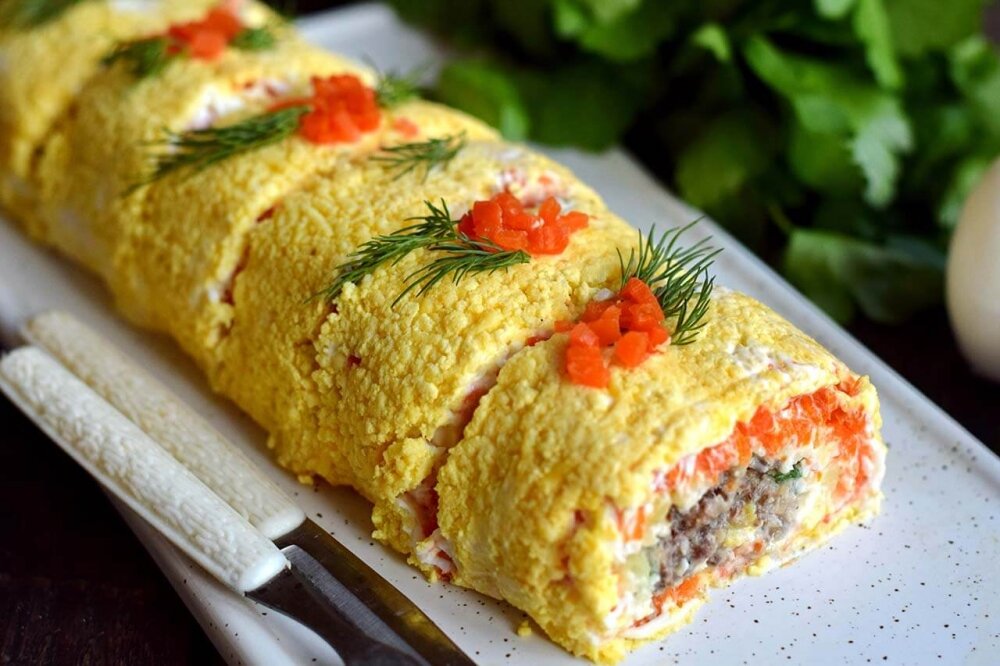 Готовим всеми известный салат под названием Мимоза. Подаем его на стол оригинально, в виде порционных кусочков одного большого рулета. Используются стандартный набор продуктов для салата Мимоза, они выкладываются слоями друг на друга в виде полотна, затем скручиваются в плотный рулет. Он очень красиво и изыскано смотрится в разрезе, станет украшением любого стола.