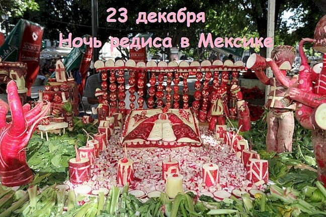 Это один из самых впечатляющих овощных фестивалей в мире. Мексиканские мастера вырезают из гигантских корней редиса людей, животных, архитектурные строения, одним словом всё – на что способна фантазия настоящих художников.