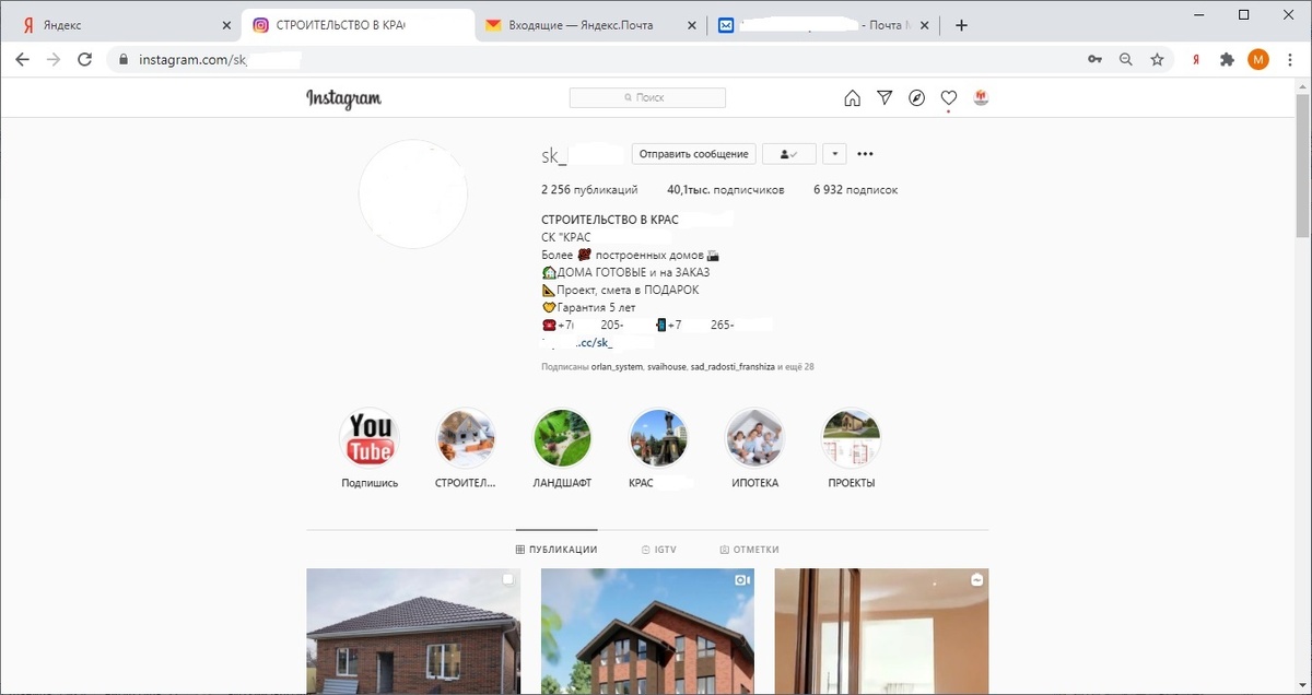 Сейчас я на примере покажу вам строительную компанию у которой есть раскрученные страницы во всех соцсетях. В инстаграм 40 000 подписчиков, 2256 публикаций. Ежедневно выкладывается по три поста.