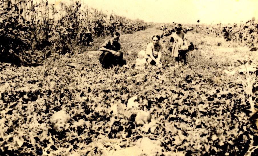 Сразу сообщаю, чтобы не строили долгих догадок - на фото запечатлена южная степная бахча. Снимок не очень качественный, но, тем не менее, вполне рассмотреть можно, как счастливое семейство: муж, жена и двое детей - ищут среди густо разросшихся плетей спелые звонкие арбузы. По краям-границам довольно обширного бахчевого участка высится кукуруза. Ой, как мне это всё знакомо и мило!