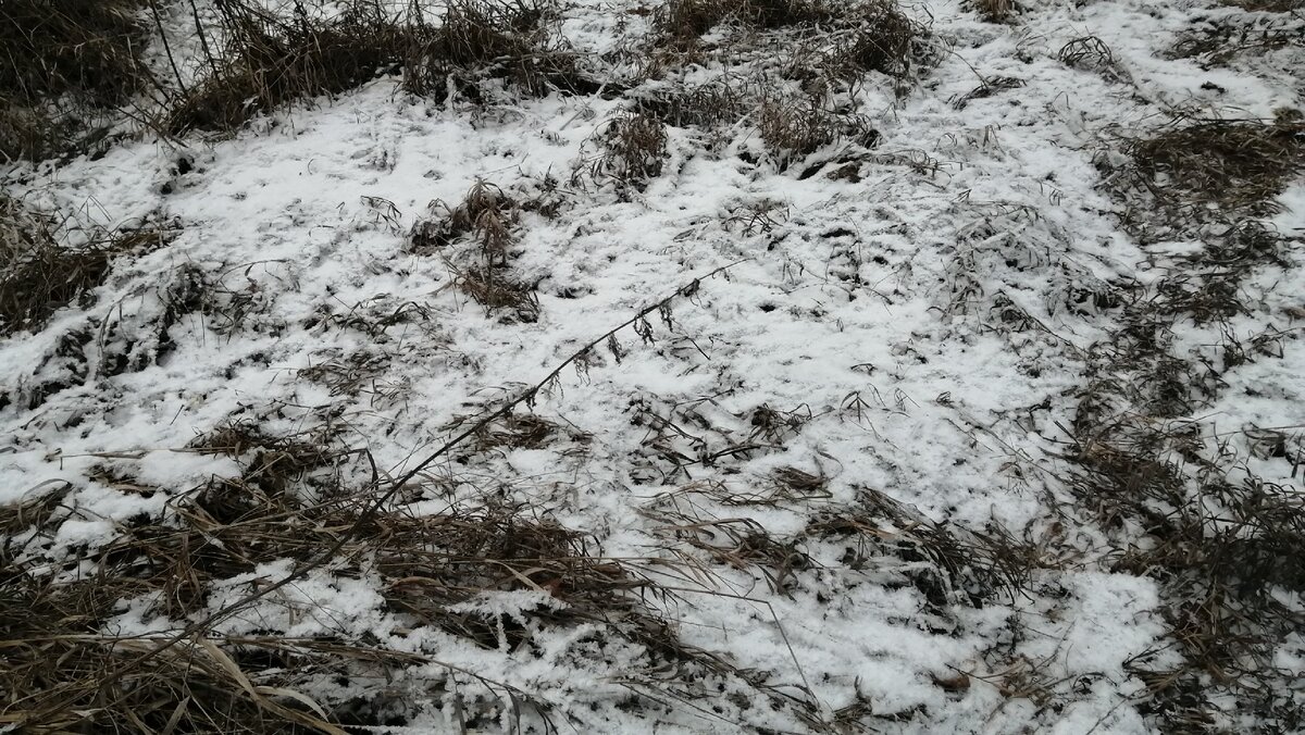 Вот по такой траве, припорошенной снегом мы шагаем по деревне к следующему дому.