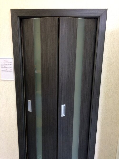 Такая дверь имеет два одинаковой ширины полотна, которые складываются аналогично книге. Размах двери при этом уменьшается ровно наполовину. Но полотна остаются в дверном проеме, что сужает его на 8 см.