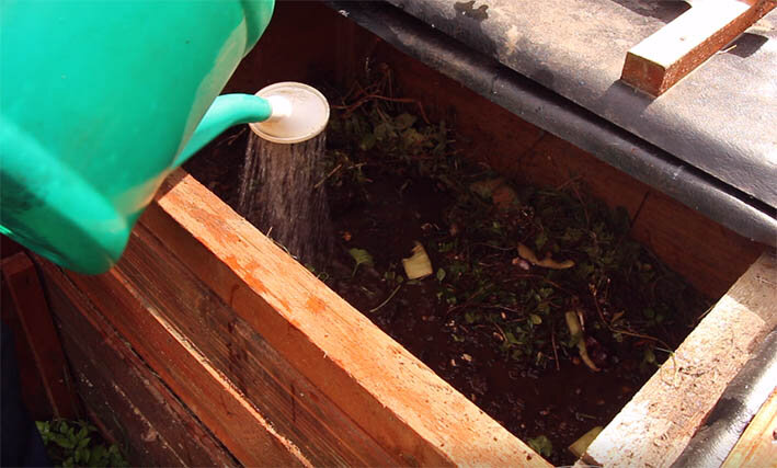 Куча с бортиками с боков и сверху обкладывается дерном и накрывается двумя слоями пленки (для сохранения тепла и чтобы не заливалась атмосферными осадками). Полив помоями, мочой, водой, настоем сорняков (1:5) обязателен, но нельзя допускать чрезмерного увлажнения, чтобы не получить вместо компоста силос или закисшую, не пригодную зеленую массу.