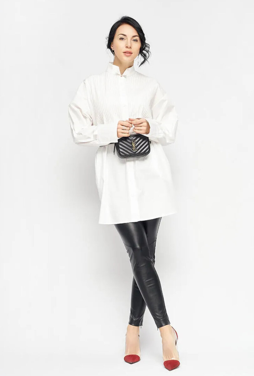 - Модная альтернатива: кожаные лосины отлично смотрятся на контрасте с вязаными объемными свитерами или кардиганами, а также их идеально дополняют а-ля мужские рубашки, которые можно носить с поясами или ремнями.