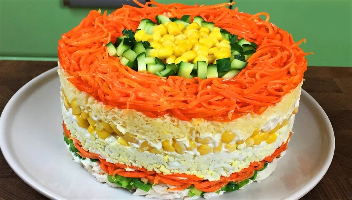 3) Украшаем салат. К центру салата приложите стакан, чтобы по краям салата ровно распределить корейскую морковку. После чего приложите к середине рюмку и выложите вокруг огурцы. Центр посыпьте кукурузой. Оставьте салат в холодильнике на несколько часов, чтобы он хорошо пропитался.