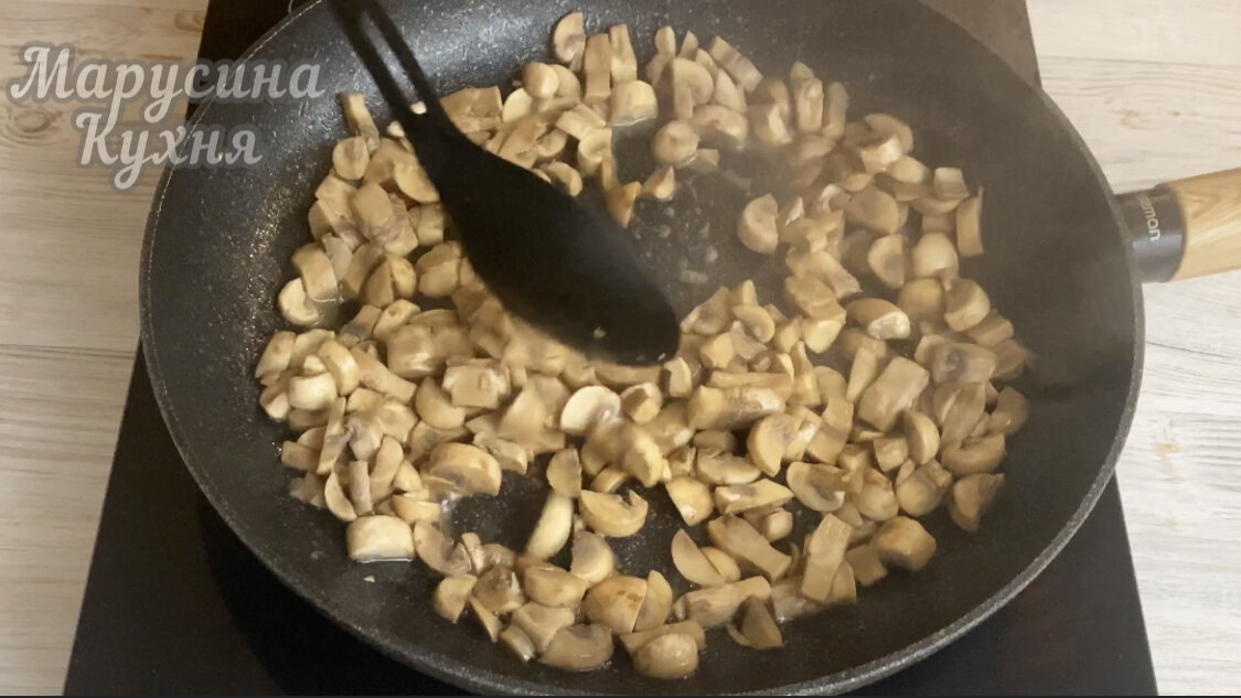 Шампиньоны мою водой и нарезаю произвольно. Тушу на сковороде около 10 минут. Весь грибной сок должен выпариться.