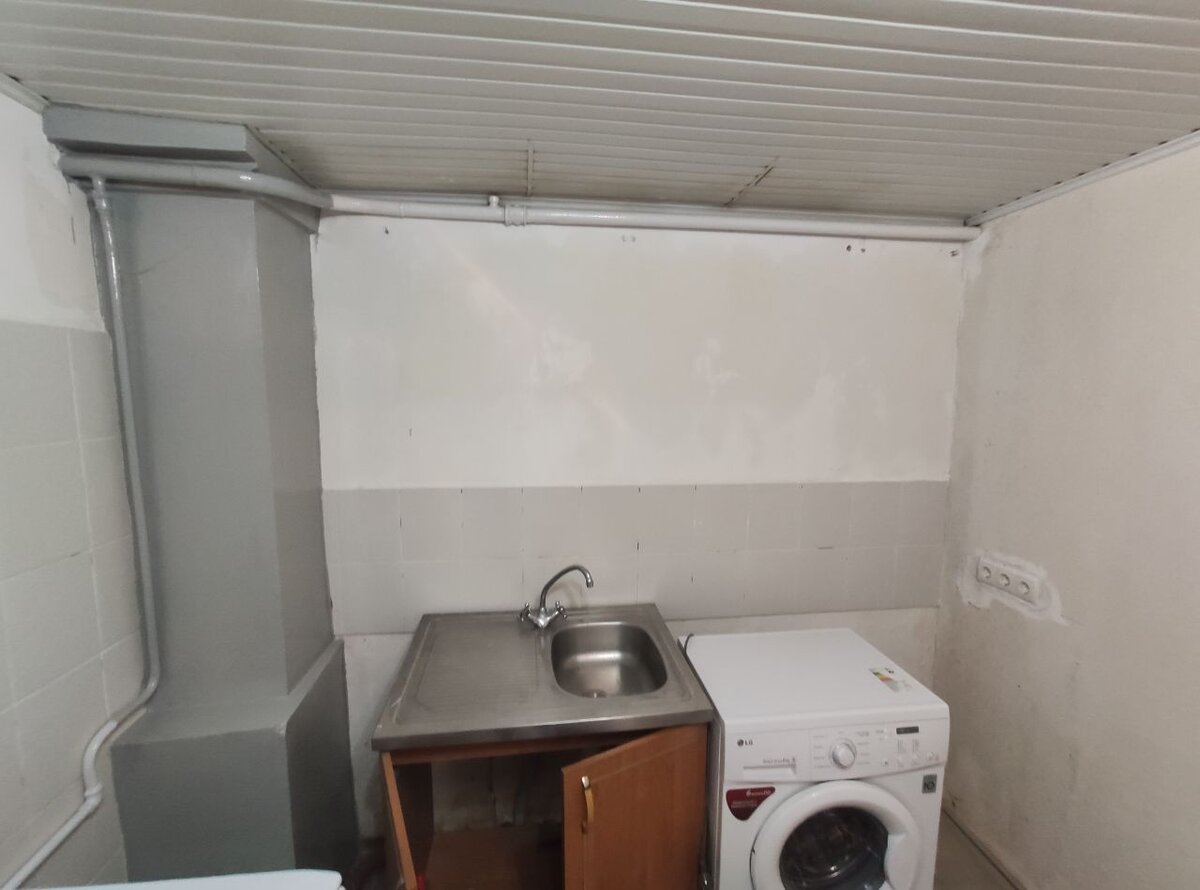 Потолок и пол оставили такими, какие они и были. Стиральная машина также осталась на своём месте, а холодильник расположен с другой стороны от кухни.