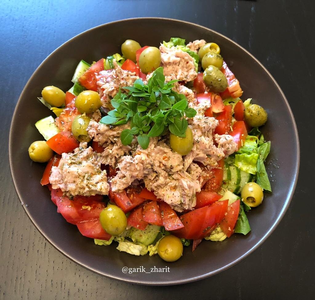 Наверное один из самых полезных и лёгких в приготовлении салатов. У меня айсберг, помидоры, огурец, оливки, базилик и тунец консервированный. Заправка оливковое масло и бальзамический уксус. Соль перец.