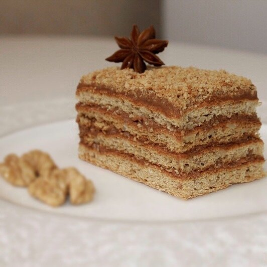 3 тонких слоя коржей с добавлением грецких орехов, натуральный крем из вареной сгущенки + щепотка чуда, чтобы удивить😉