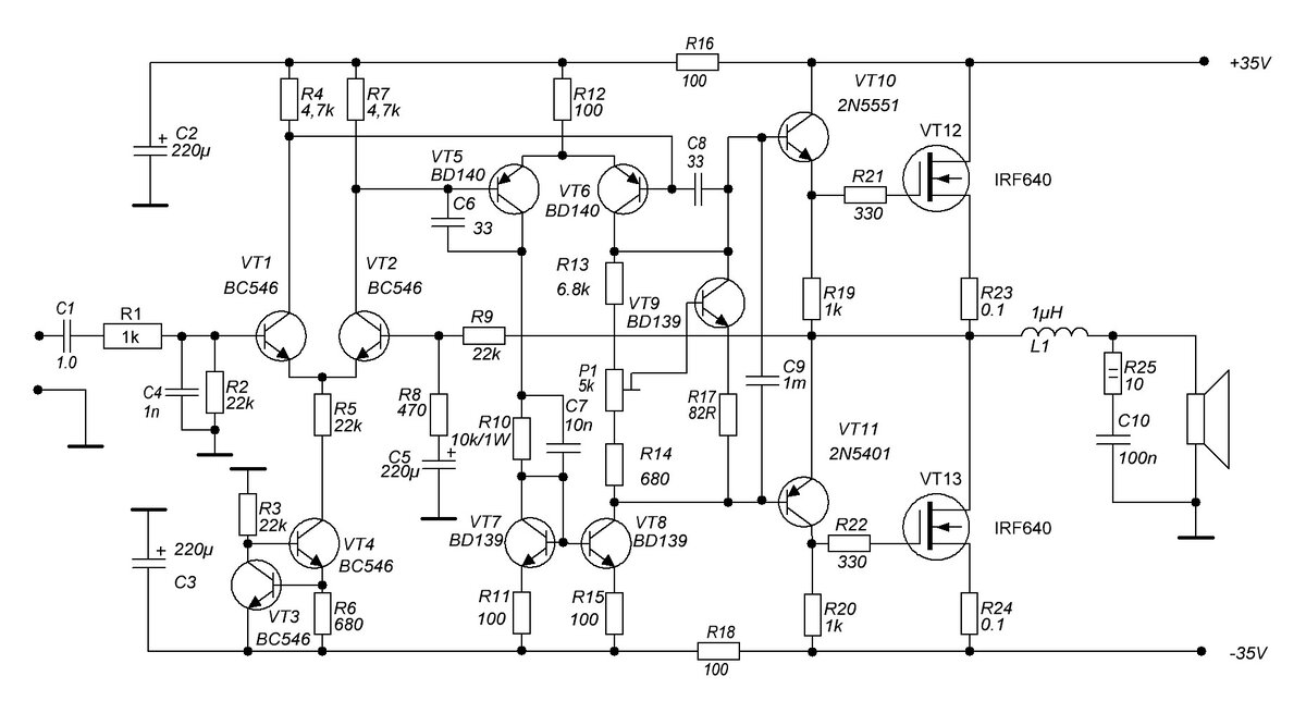 За основу был взят какой-то из бесчисленного множества "Холтон", выходную часть выкинул и прикрутил выход на составных N-канальных мосфетах, - сделать это удалось применив составные транзисторы, в одном плече пара "Дарлингтона", в другом пара "Сиклаи".
